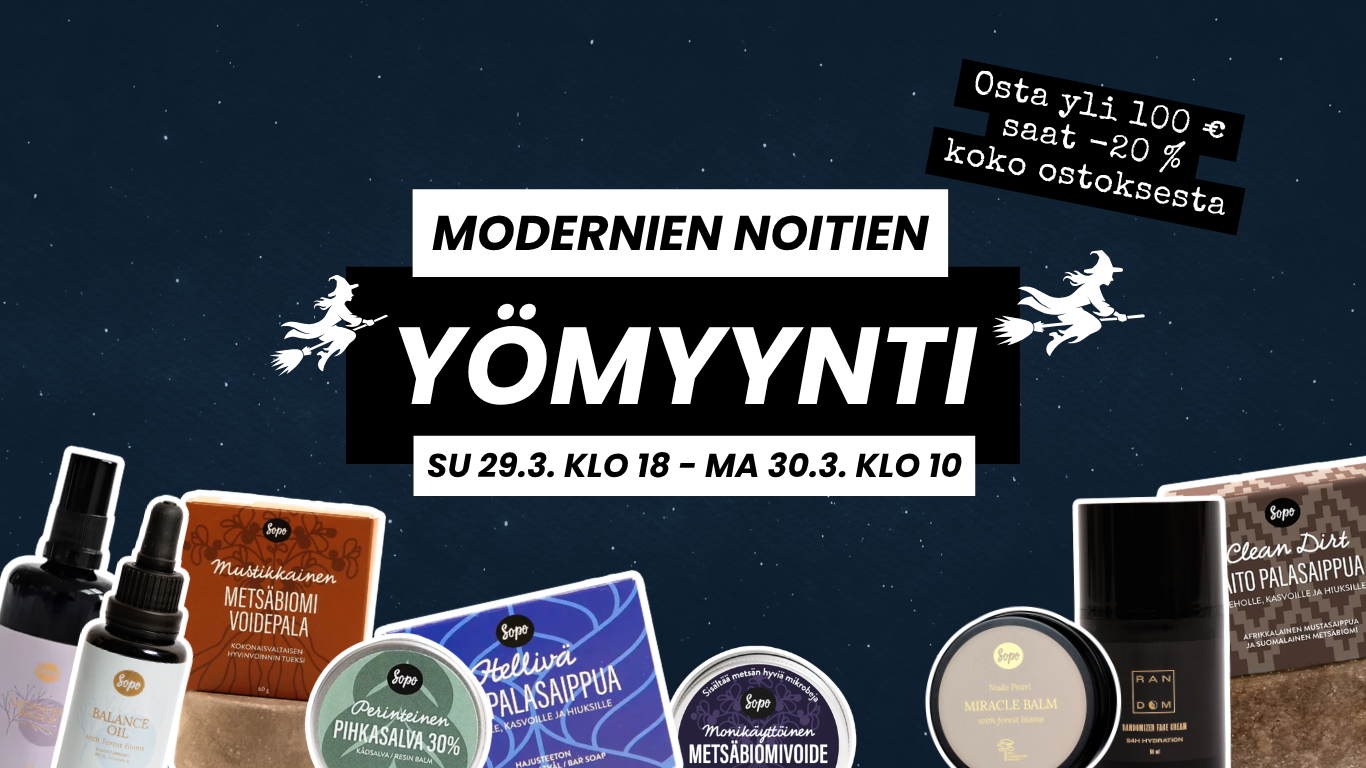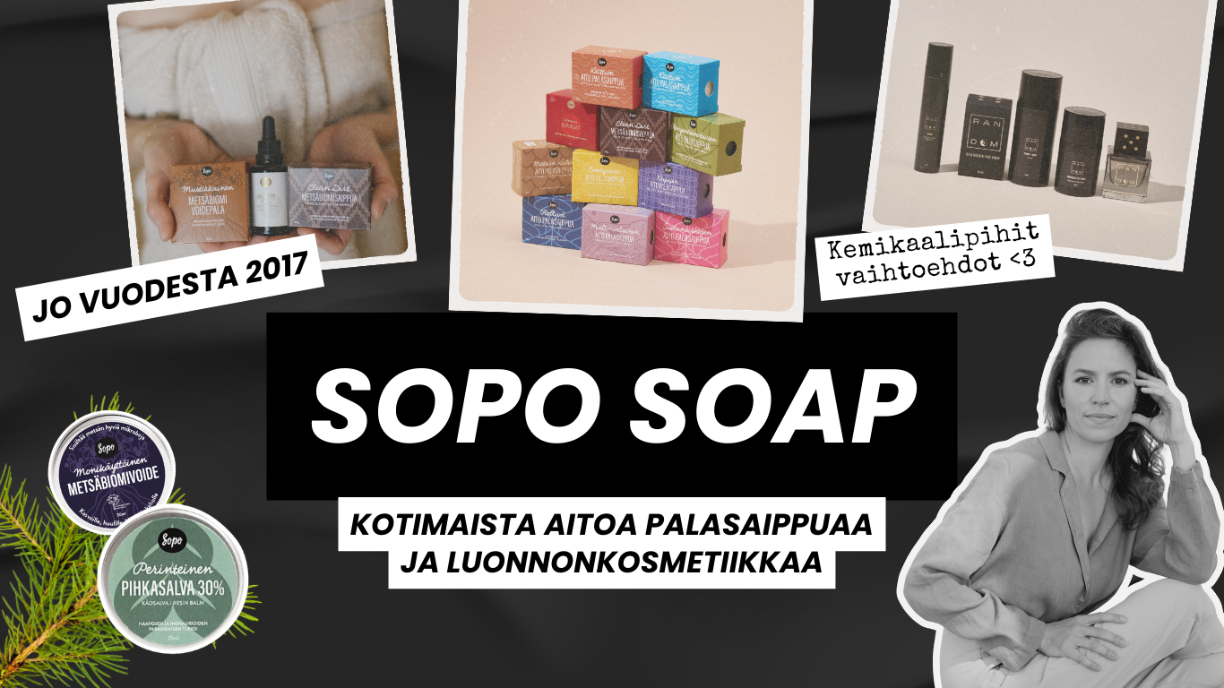 Sopon tarina alkoi tarpeesta saada aitoa palasaippuaa ilman turhia lisäaineita. Siitä se ajatus sitten lähti... Maria ja Reino Nordinin perheyritys Sopo valmistaa aitoa kotimaista palasaippuaa ja luonnonkosmetiikkaa vain luonnon omia raaka-aineita hyödyntäen.